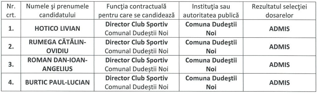 Comisia de concurs comunică următoarele rezultate ale selecției dosarelor de înscriere:
